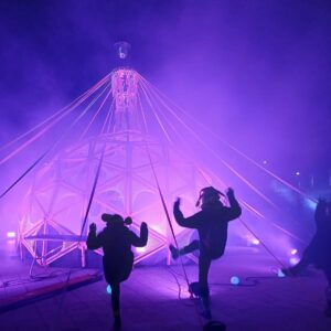 The Beacon itself is a large 6.5m diameter wooden dome structure, with panels of laced UV reflective threads, and with a tall 6m spire with an array of 11m UV reflective ribbons, ready to be woven in a maypole plait, and with a glitterball to top it all off! The Beacon is lit by a ring of colour-changing lights, changing moods and states, making it a mesmerising spectacle in its own right.
